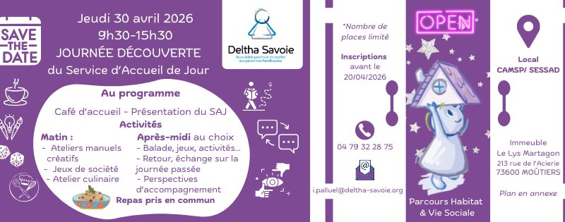 Le Parcours Habitat et Vie sociale vous donne rendez-vous le 30 avril pour une Journée découverte au Service d’Accueil de Jour de Moûtiers ! Tout un programme : café d’accueil, présentation du SAJ, de nombreuses activités et un déjeuner !