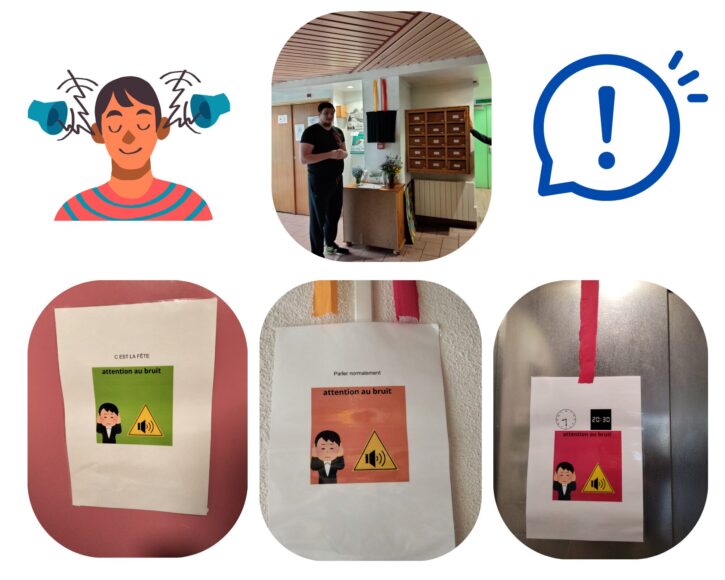 le 20 mai, Loïc, résident, a présenté à l’ensemble des personnes accompagnées, des cadres et d’un représentant du conseil d’administration, cette campagne qui fait suite à du bruit régulier des résidents (problème pour celles et ceux ayant des particularités sensorielles), et à l’insonorisation des murs.